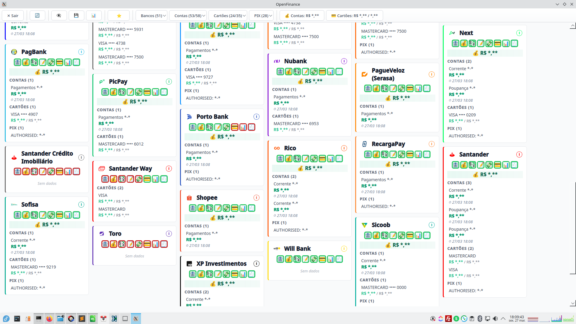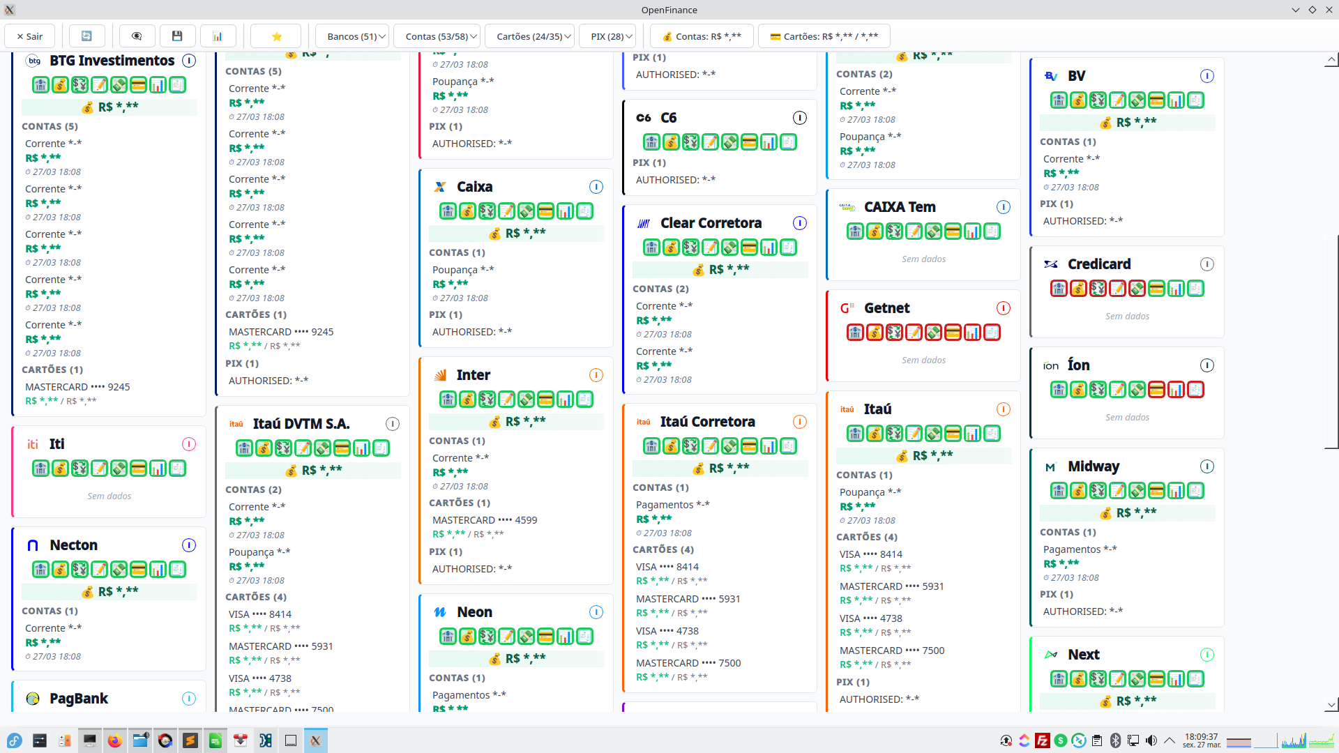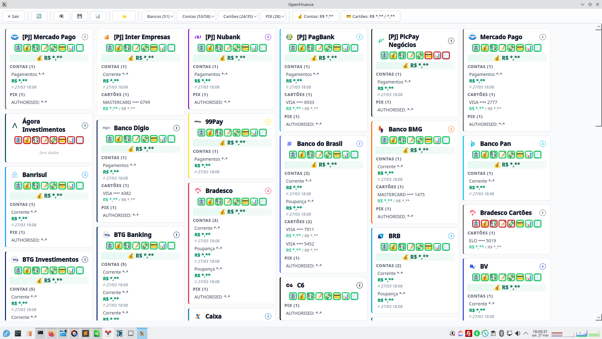 Software desenvolvido em C++ para Linux e Windows que consome dados do ecossistema OpenFinance e consolida, em uma única tela, todas as informações financeiras de todos os bancos vinculados — contas, cartões de crédito e autorizações Pix.